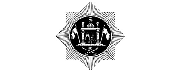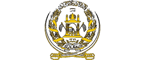 Пшеничные колосья перевиты лентой цветов флага, на нижнем витке ленты арабскими буквами написано название страны: «Афганистан».