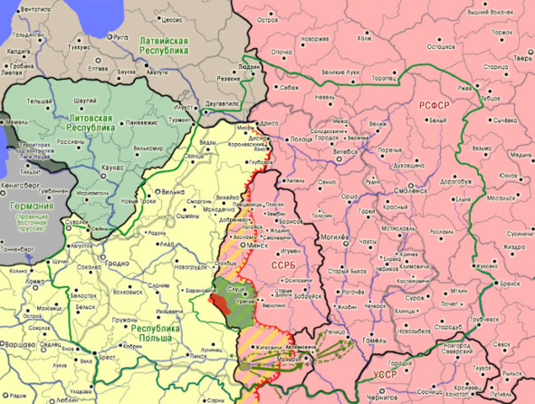 Однако в ходе Варшавской операции войска Западного фронта были практически разгромлены, потеряв 25 000 убитыми и ранеными, 66 000 пленными и почти 50 000 интернированными в Восточной Пруссии, а также более 200 орудий и более 1000 пулеметов27, и 20 августа польские войска вышли на линию Брест-Литовск – Высоко-Литовск – р. Нарев – р. Западный Буг, 22 августа заняли Остроленку, 23 – Белосток, а 28 подошли к Минску, оккупировав значительную часть территории Беларуси. Ввиду такой обстановки на фронте 23 августа на переговорах в Минске польская делегация дала отрицательный ответ на все советские предложения и 2 сентября стороны согласились перенести переговоры в Ригу, после чего делегации покинули Минск.