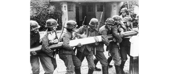 Немецкие солдаты ломают шлагбаум на границе с Польшей.