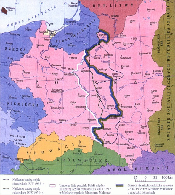 В Польше граница сфер влияния между Германией и СССР прошла по рекам Нарев, Висла и Сан.2