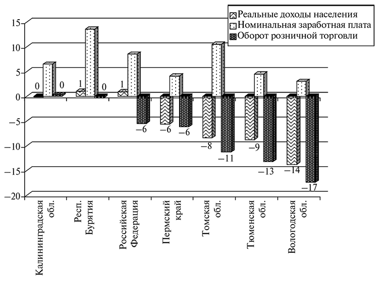 Рост реальных доходов населения сохранился в менее развитых республиках и некоторых регионах Дальнего Востока. Они слабее затронуты кризисом, при этом получают большие федеральные трансферты, обеспечивающие стабильность выплат, заработной платы многочисленным бюджетникам и социальных пособий. Именно по этим причинам в Бурятии доходы населения не сократились. Из тренда выбиваются только реальные доходы населения Калининградской области. Их сохранение на уровне 2008 г. не выглядит достоверным, так как рост номинальной заработной платы на 7 % не покрывал инфляцию, а рост социальных выплат населению из бюджета области был ниже среднего по РФ (соответственно на 17 и 29 %).