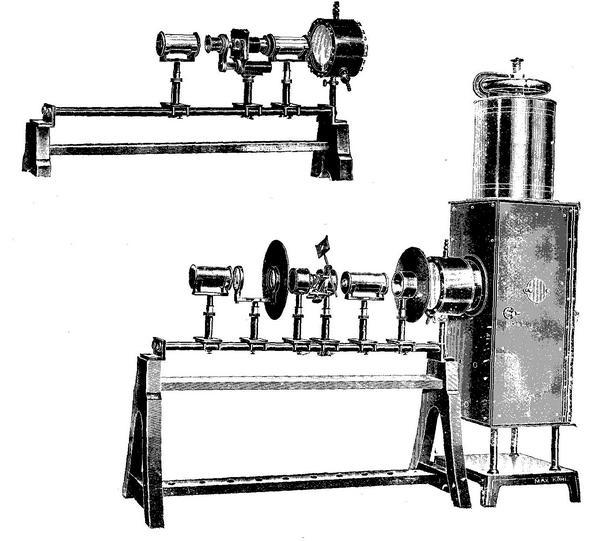 К общему оборудованию кабинета относились воздушный насос (рис. 2.4) и проекционный аппарат (рис. 2.5), которые выпускала упомянутая выше фабрика Трындина. Следует заметить, что линзы конденсора в проекционном фонаре были наливные, о чем свидетельствуют наливные и сливные краны на корпусе конденсора. Наблюдается определенное сходство с современным универсальным проекционным аппаратом ФОС-115 (фонарно-оптическая скамья).