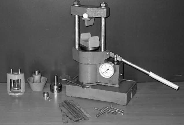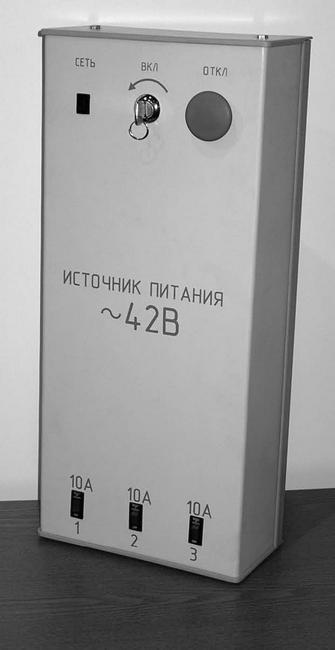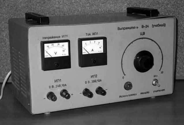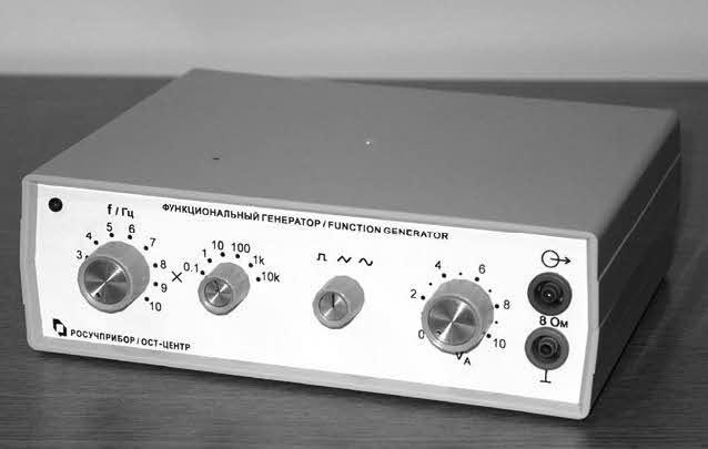 Блок «Общее оборудование» обеспечивает, посредством комплекта электроснабжения (внешний вид щита электроснабжения представлен на рис. 4.2), электропитание рабочих мест учителя (1 точка) и обучаемых (30 точек) переменным током напряжением 42 В, частотой 50 Гц на рабочие места обучаемых. От щита идут три линии по 10 точек, ток нагрузки – по 10 А. Одна точка расположена на рабочем месте учителя, там же имеются еще три дополнительные точки напряжением 220 В и частотой 50 Гц. Защита электрической цепи автоматическая в течение 0,1 с при возникновении тока утечки более 0,001А. Рабочее место учителя обеспечивается: выпрямленным регулируемым напряжением 0–24 В, 10 А, переменным регулируемым напряжением 0–30 В, 1 А (на рис. 4.3 представлен внешний вид источника переменного и постоянного тока), высоким напряжением от 5 кВ до 30 кВ, 0,3 мА (на рис. 4.4 представлен внешний вид источника высокого напряжения). Кроме того, обеспечивается генерирование электрических колебаний синусоидальной, прямоугольной и пилообразной формы в диапазоне частот от 0,1 Гц – 100 кГц при амплитуде напряжения на нагрузке 8 Ом, регулируемом в диапазоне 0–10 В (на рисунках 4.5 и 4.6 представлены функциональный и звуковой генераторы). Рабочее место учителя обеспечивается насосами, которые позволяют быстро получить вакуум до 0,3 мм рт. ст. (насос вакуумный, рис. 4.7) и создать давление воздуха до 200 кПа (насос воздушный ручной, рис. 4.8). Кроме того, обеспечивается создание механического давления до 15,2 МПа (пресс гидравлический, рис. 4.9).
