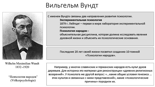 Следующий шаг в направлении создания нашей дисциплины был сделан известным психологом, философом, естествоиспытателем и языковедом Вильгельмом Максимилианом Вундтом (Wilhelm Maximilian Wundt, 1832–1920).