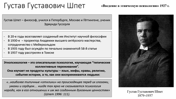 Г. Г. Шпет же, во-первых, по-новому определяет предмет будущей этнопсихологии – коллективное переживание как социальный феномен и продукт межличностных отношений, как надындивидуальная психологическая реальность.