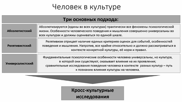 Еще одно направление – это кросс-культурные исследования. В основе этого подхода лежит универсалистское понимание социокультурной системы, представление о единстве строения и функционирования культуры при всем многообразии ее частных вариантов. Тогда сопоставление различных культур и их аспектов может стать источником понимания наиболее общих закономерностей. В самом широком смысле кросс-культурные исследования – это познание путем сопоставления.