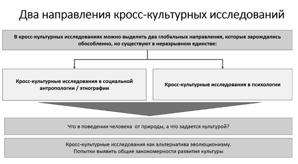В кросс-культурных исследованиях можно выделить два глобальных направления, которые зарождались обособленно, а теперь, безусловно, переплелись и существуют в неразрывном единстве: