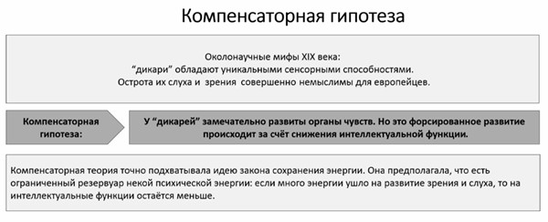 Приблизительно в то же время в XIX в. был открыт закон сохранения энергии в физике (первые его формулировки относятся к 1840-м гг.). Компенсаторная теория точно подхватывала идею «энергетического баланса»: существует некий ограниченный объем энергии, которая перераспределяется, – одно за счет другого. Если много энергии ушло на развитие сенсорики, то на долю интеллектуальных функций ее придется меньше.
