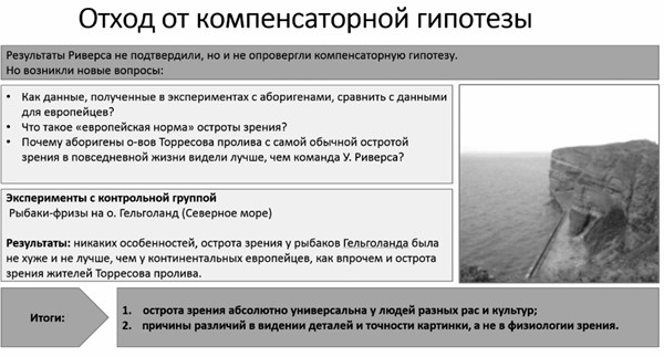 Было обследовано 170 туземцев. И что же?.. Никакой уникальной остроты зрения, как и у европейцев, есть люди с прекрасным, средним и с плохим зрением. Риверса обескуражило другое: аборигены, которые во время экспериментов показали средний результат, во время совместных прогулок по острову видели гораздо лучше, например, птиц, спрятавшихся в кроне деревьев. Один абориген с весьма средним зрением заявил, что на противоположной стороне острова в бухте пришвартовались корабли. Когда же Риверс спросил, откуда он об этом узнал, он указал на две еле различимые точки на линии горизонта и пояснил, что это не что иное, как верхушки мачт кораблей, которые зашли в гавань (Там же: 64).