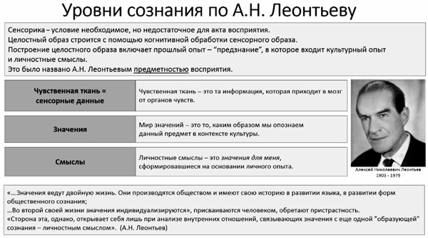 А. Н. Леонтьев показал, что в нашем сознании есть три основных уровня: чувственная ткань (в ней отражается внешний мир), уровень значений и уровень смыслов.