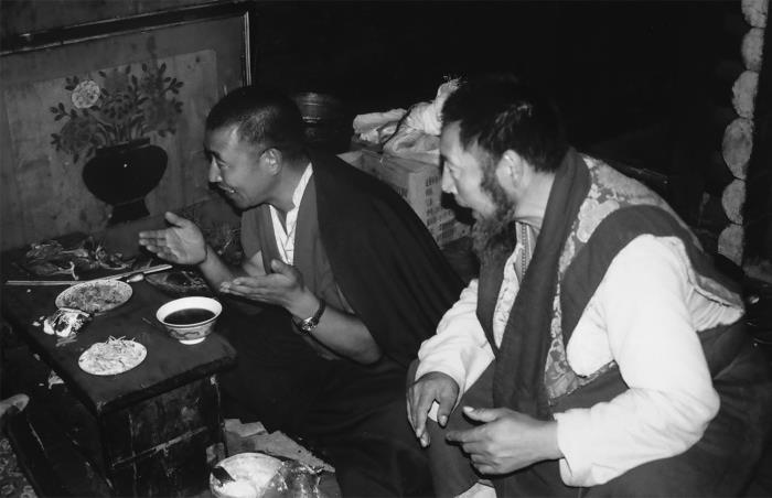 Над ступой на склоне горы мы увидели скит – небольшую хижину, построенную целиком из неокрашенной древесины. Её отделял от луга, который украшали летние цветы, беспорядочный частокол, который должен был защищать огород, расположенный перед ветхим крыльцом. Мы поднялись на склон и вскоре, вдохновлённые духовной атмосферой места, сняли ботинки и стали делать простирания вместе с послушниками и монахинями. К счастью, мы с Джоном Морганом уже привыкли к высоте, потому что только приехали из исследовательской поездки в Долпо. Должно быть, мы находились на высоте около 3 700 метров. Завершив восхождение, мы оказались в окружении группы учеников и родственников Кхенпо, которые ожидали нашего прибытия. Лама Норта пригласил нас войти, чтобы вместе со всеми почтить это место жизни, практики и смерти святого Кхенпо. Многочисленные свежие цветы в вазах занимали всё свободное место внутри скита. Мы так радовались своему прибытию, что без раздумий стали совершать простирания, читать мантры, молитвы и проливать слёзы преданности и радости. Благодаря объяснениям ламы Пуяга лама Норта согласился провести с нами беседу: потом мы все сели за чай.