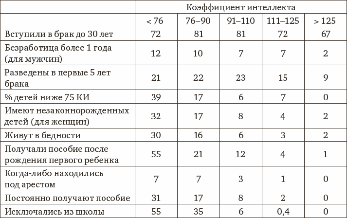 Большой скандал в США вызвала книга Хернстайна и Мюррея (Herrnstein, Murray, 1994). Между тем в ней содержится много интересных фактов. В таблице 1.3 суммированы некоторые из приводимых в книге исследований, учитывающих жизненные обстоятельства людей различного интеллектуального уровня в США.