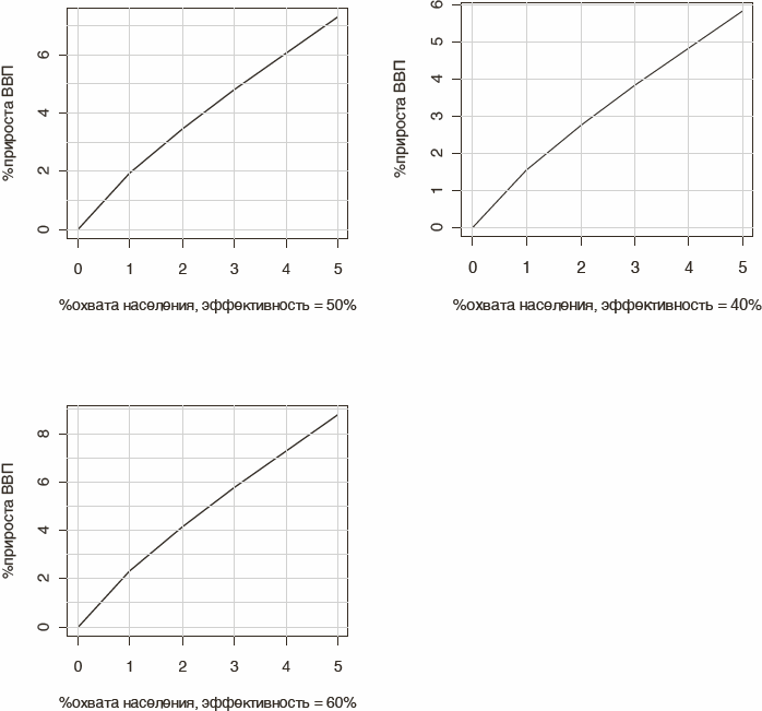 Очевидно, что вторая производная функции прироста ВВП при увеличении охвата населения является отрицательной, т. е. при увеличении охвата отдача от программ в пересчете на душу населения снижается. Это означает, что наибольшего экономического эффекта следует ожидать от работы с достаточно узкой прослойкой интеллектуальной элиты. Тем не менее при пятипроцентном охвате экономическая эффективность программ продолжает оставаться очень высокой.