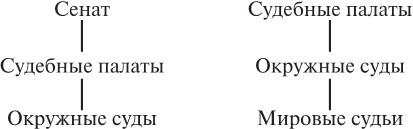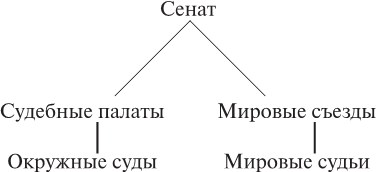 I. Основную группу судов составляют судебные учреждения, созданные Судебными уставами 1864 г. Они подразделяются на мировые, разрешающие дела малоценные, и общие, к ведомству которых отнесены все остальные дела. Как в тех, так и в других имеются три степени, или инстанции: первой являются мировые судьи и окружные суды, второй – мировые съезды и судебные палаты, а третьей – Гражданский кассационный департамент Сената. Таким образом, система судов по Судебным уставам 1864 г. имеет следующий вид:
