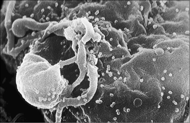 Заражённый T-лимфоцит. Многочисленные светлые круглые выпуклости на его поверхности – места сборки и отпочковывания вирионов ВИЧ