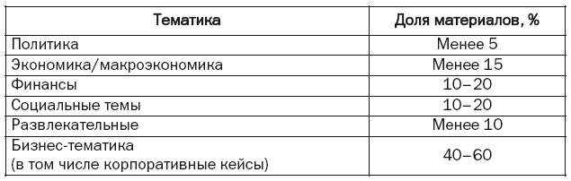 Непосредствннно бизнес-тематике должна быть посвящена приблизительно половина площади журнала, отданной под журналистские материалы. Именно так поступают американские деловые журналы, практически этого уровня придерживается «Смарт Мани».