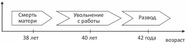 Следующий за увольнением еще один травмирующий эпизод – развод указывает на цикличность травмирующих событий с интервалом в два года. Очевидно, что психотерапевтическая помощь такому человеку должна носить длительный и системный характер.