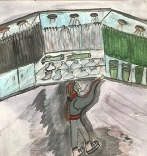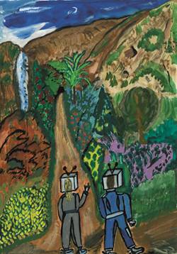 Пуэйла внимательно следила за маршрутом; eё утомляла однообразная картина движения. – Мысли постепенно уводили её в прошлое – «Вот она летит с Фэйэймом на «Кобре»; Экран вспыхнул, на нём загорелась надпись: «Аварийная посадка», тут же выбросились специальные подушки. Через некоторое время последовал толчок, они упали на пол и потеряли сознание. Свет погас. Когда она пришла в себя, вокруг было темно. Она дернула шнурок аварийного освещения на костюме. Загорелась зелёная лампочка. Пуэйла огляделась и увидела лежащего друга. Она бросилась к нему и попыталась открыть защёлки шлема: странно, они открылись безо всяких усилий. Девочка достала контейнер с водой и начала протирать лицо Фэйэйму. Он открыл глаза и пошептал: – Где я? – Я бы тоже хотела знать, где я? – сказала Пуэйла и заплакала оттого, что теперь она точно не увидит маму, которая снова улетит на очередную планету, а она будет ждать её и скучать. И подарок она маме не сделает ко дню рождения, потому что противный Фэйэйм его просто уничтожил: – Мама, мамочка! – это всё Фэйэйм – дурачок, он во всём виноват, – приговаривала она. – Кончай, ныть! – грозный голос мальчика, остановил её причитания. – От твоих слёз скоро будет болото. Нам надо осмотреть корабль и вычислить координаты, потом наладить связь с домом. Для этого нам надо выйти из корабля, установить координатомер на поверхности, для начала определить планету, на которой мы удачно сидим. Поднимайся, надень защитную куртку, проверь герметичность шлема, возьми воду и еду! – приказал новоиспеченный командир. Сам подошёл к двери и опустил рычаг. Они вошли в дополнительный коридор, открыли люк и попытались опустить трап, – он никак не хотел опускаться, его заклинило. – Надо найти веревочную лестницу или канат, – произнёс командир, – наверное, это всё есть на полке снаряжения. Посмотри! – У меня есть, – ответила Пуэйла и достала канат из кармана. – Такой тонюсенький, он же нас не выдержит! – воскликнул Фэйэйм. – Ещё, как выдержит! Это бабушкин канат – специальный канат! – Он сделан из волос Гридеры и металлической проволоки. Волосы Гридеры очень липкие, они склеивают металлическую проволоку лучше любого клея. Живут Гридеры на Красной планете, где сейчас работает мой дедушка. Гридеры это косматые собаки, – пояснила девочка. Мальчик взял канат и привязал его специальным узлом к ручке защитной двери, затем сделал кольцо: – Это узел Когмы; садись, не бойся, я подстрахую тебя; главное не раскачивайся. На, возьми перчатки. – Надо же, у тебя даже перчатки есть?!– удивилась девочка; надев их, она начала медленно спускаться. После её спуска, Фэйэйм подтянул канат и вскоре стоял рядом с ней. Было очень жарко! – Смотри, смотри, как здесь красиво! Небо голубое, а трава зелёная! А горы, горы! Они покрыты зеленью! Смотри! Смотри! Вода течёт! Все не так, как у нас! – восторгался мальчик. – Постой, постой, папа рассказывал, что на Земле тоже небо голубое. Значит мы где-то рядом с Землей? – Сейчас, мы постараемся определить своё местонахождение, – с достоинством ответил спутник. – Он установил координатомер, но прибор ничего не показывал; стрелка безжизненно упала. – Надо осмотреть местность, – сказал мальчик. Пуэйла почувствовала головокружение и посмотрела на Фэйэйма. Мальчику тоже явно было не по себе.