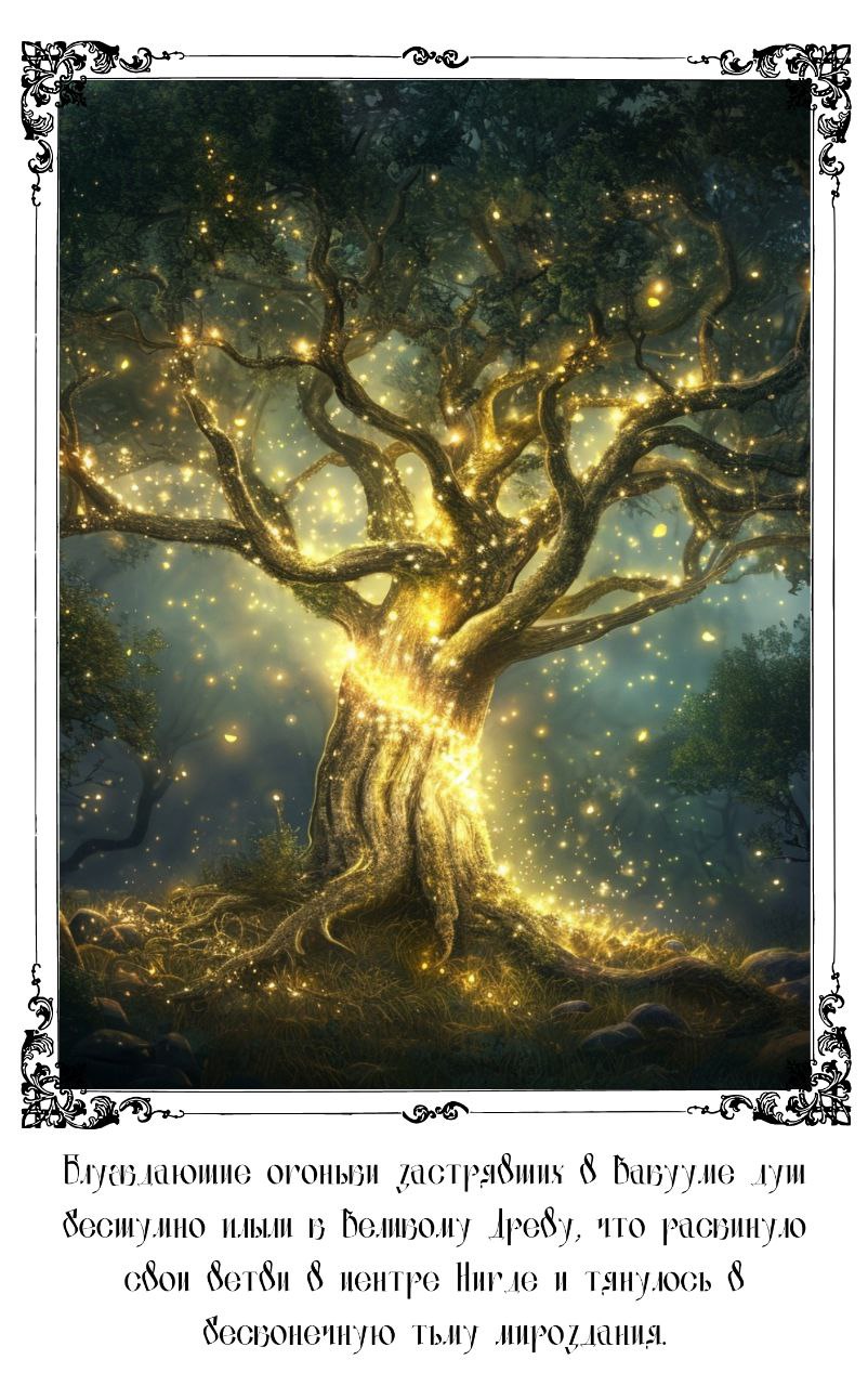 В Нигде не существовало ни дня, ни ночи, но вселенский мрак навис над городом плотной пеленой тумана. Там, за дверьми Заведения, по мощеным улочкам ползли тени, призраки задували свечи в фонарях, и зловещие силуэты таяли и переплетались в танце невидимых нитей. Блуждающие огоньки застрявших в Вакууме душ бесшумно плыли к Великому Древу, что раскинуло свои ветви в центре Нигде и тянулось в бесконечную тьму мироздания, сплетая собой неисчислимое множество затерявшихся в Пустоте островков-городков Межмирья, блуждающих средь Черных вод.