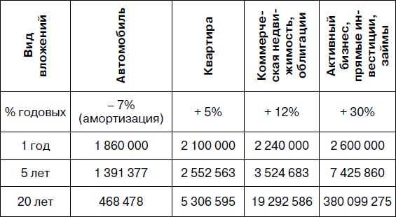 Заработанный (или полученный в наследство, выигранный в лотерею и прочее) капитал 2 млн руб. мы вкладываем в различное имущество и с годами получаем совершенно разный финансовый результат. К примеру, ежегодная разница между владением коммерческой недвижимостью и квартирой составляет 140 тыс. руб. или более 10 тыс. руб. в месяц, которые можно положить в карман, арендуя квартиру за 5 % от ее стоимости, а за 20 лет разница составит 14 млн руб. Если же вы развиваете свой бизнес, то получите еще больше – от 600 тыс. руб. в год, что за вычетом стоимости аренды квартиры даст прибыль полмиллиона рублей.