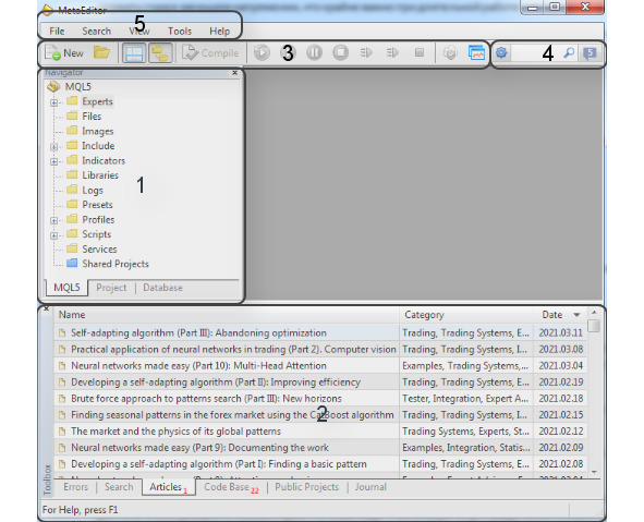Верхняя справка (1) – это руководство пользователя по MetaEditor. В этом справочнике вы можете найти много полезной информации о функционале программы MetaEditor.