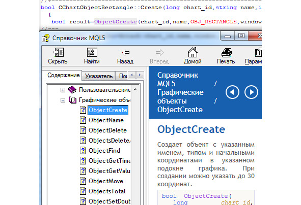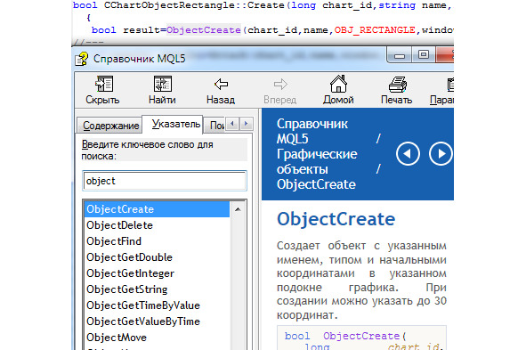 Например, рассмотрим вариант с поиском объекта. Вводим в графе поиска object, нажимаем enter и ниже в списке видим результаты поиска по нашему запросу. Двойным щелчком левой кнопки мыши выбираем ObjectCreate, переходим с правое окно и видим всю информацию о создании объектов. Проматываем ниже до таблицы с вариантами объектов и выбираем к примеру прямоугольник OBJ_RECTANGLE. Далее открывается окно с информацией об объекте прямоугольник и готовый код о том, как создать готовый прямоугольник, пример готовой работы с созданием данного графического объекта.