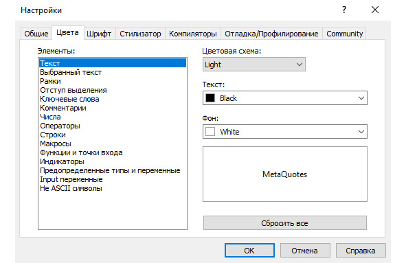 – Стилизатор – здесь вы можете выбрать стиль оформления для форматирования кода. Стандартно предложен вариант MetaQuotes, при необходимости вы можете заменить его на любой из предложенных вариантов, например, Mozilla или Java.