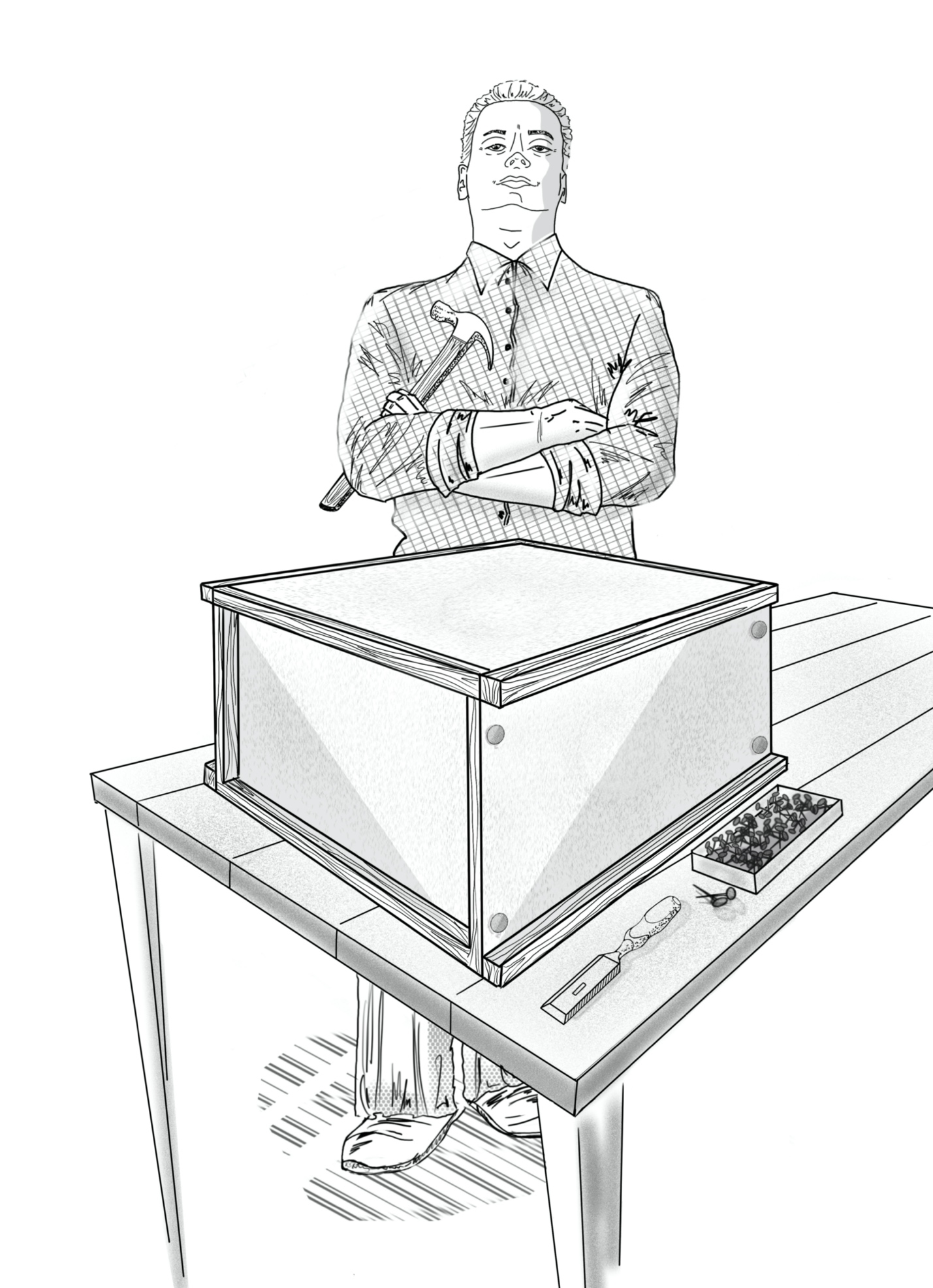 Потом, он сам сколотил один ящик в нужной последовательности. После этого мы должны были сами сделать первый почтовый ящик. ДВП уже была нарезана по размеру, а рейки мы пилили сами. Петр Ильич ходил и поправлял каждого, кто ошибался или неправильно держал инструмент. Хвалил за самые маленькие успехи.