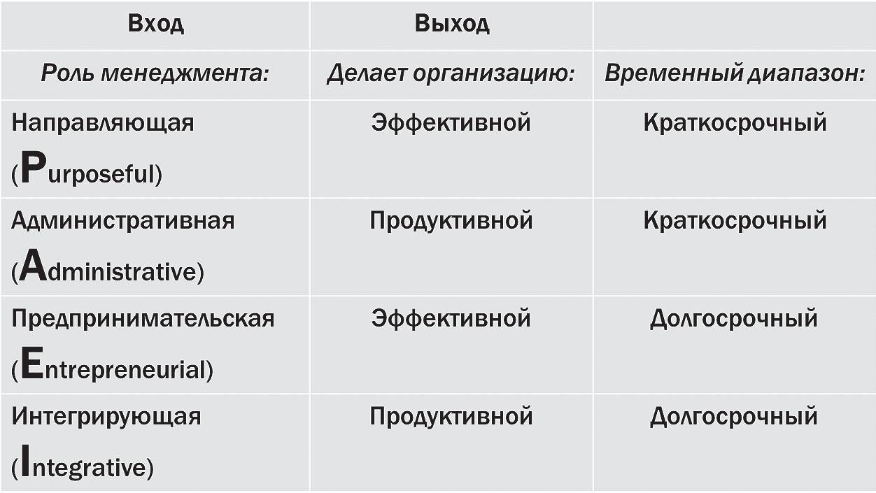 Роль, которая визуализирует будущее изменение потребностей и проак- тивно позиционирует организацию с учетом прогнозируемого будущего, по И.К. Адизесу называется предпринимательской ролью (Entrepreneural role)⁵.