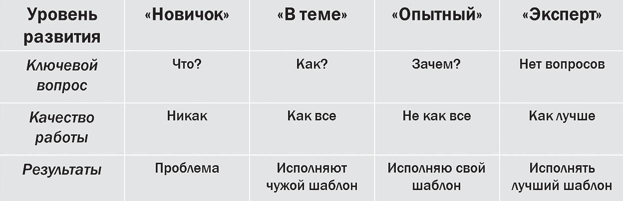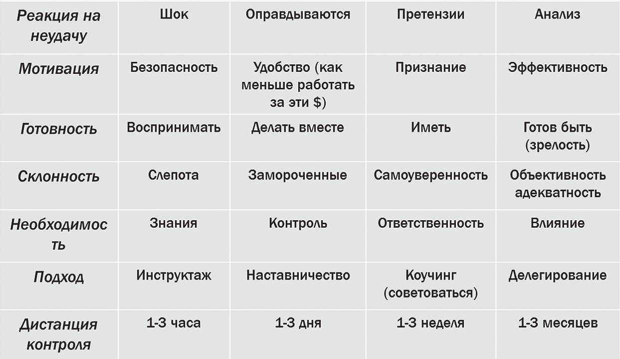 Предлагаемая техника проста и понятна в использовании. Обратите вни- мание, что в таблице Андрея Саенко представлены сразу как вопросы для определения принадлежности человека в определенном аспекте к определен- ной ступени «мастерства», так и способы работы с ней: подход при постановке задачи, периодичность контроля исполнителя, формулирование и акцент на мо- тивацию.
