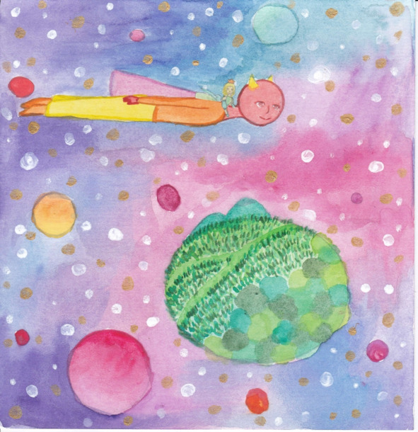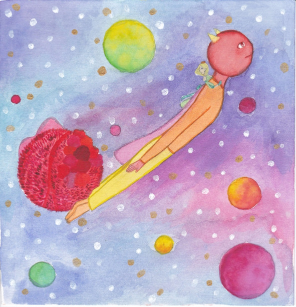 – Вот это полет! – подумала она, когда увидела свою родную планету красных рубинов далеко внизу и постепенно она удалялась от них и превращалась в маленькую красную точку.