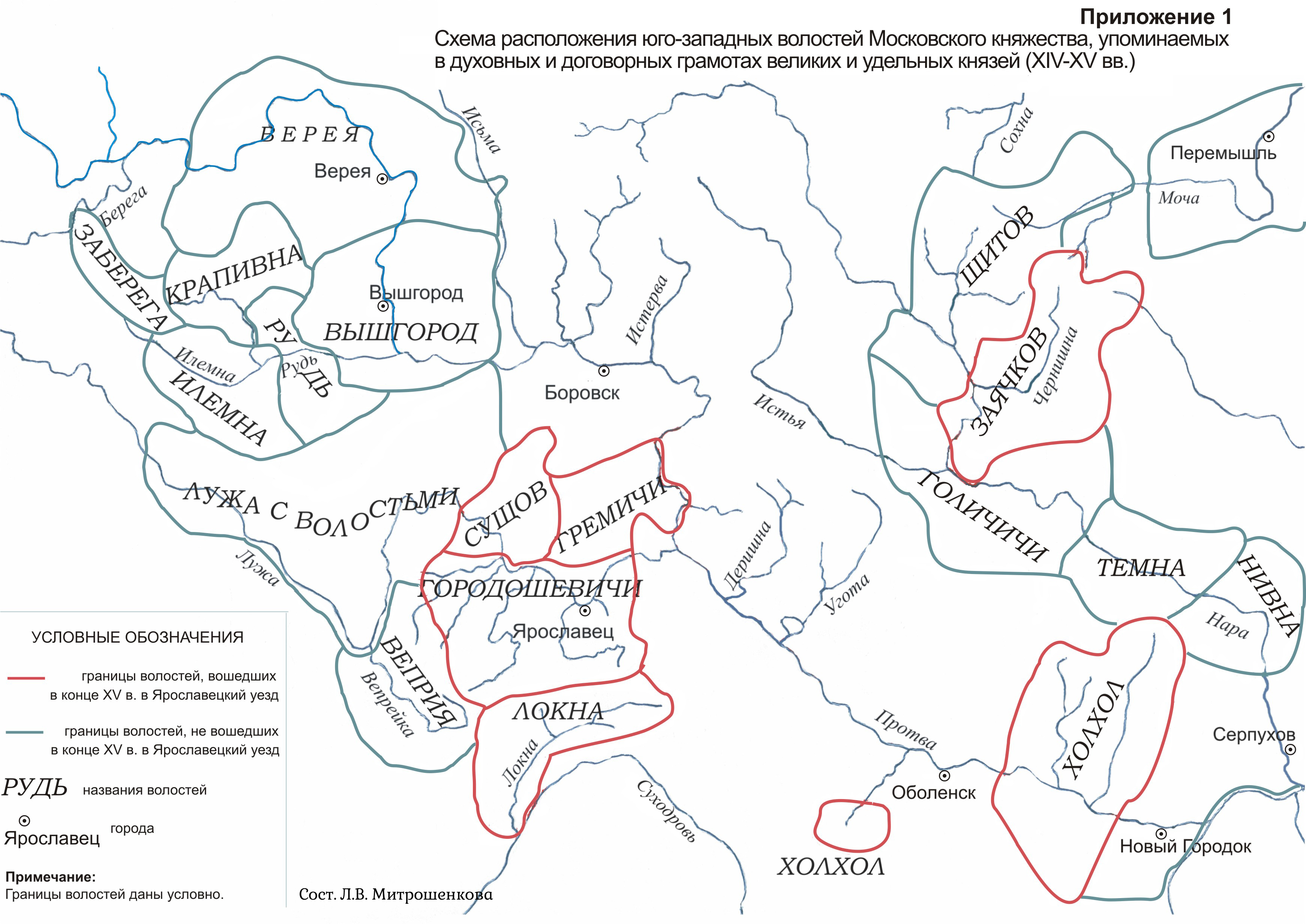 В договорной грамоте великого князя Дмитрия Ивановича с серпуховским князем Владимиром Андреевичем (между 10 апреля и 15 июня 1371 г.174) последний, насколько можно судить по плохо сохранившемуся тексту, перечисляет земли, которые он желал бы получить175. Искомые земли принадлежали в это время вдове Семена Гордого Марии. Княгиня владела ими лично, эти волости не входили в состав Московского или Великого княжения, и поэтому, в отличие от других, завещанных ей Семеном территорий, Иван Красный отобрать их у вдовы не решился. После “живота” княгини Марии Александровны их и хотел получить активно занимавшийся делами своего княжества Владимир Андреевич. Речь идет о четырех волостях, составивших позднее ядро Ярославецкого уезда – Гордошевичах, Гремичах, Сушове, и Заячкове, а также еще о трех соседних – Вышгороде и Руди с Кропивною (см. приложение 1). Напомним, что именно эти семь волостей и считает В.А. Кучкин “благословением” тетки Анны.