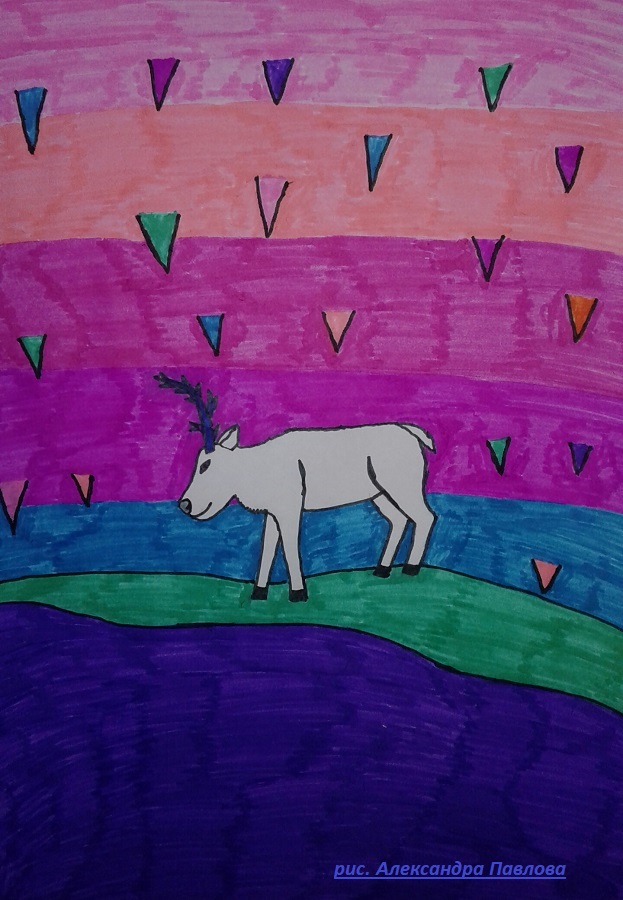 Легендарного оленя Оллика я первое время совсем не видела, а потом обнаружила его в ледяной пещере ночью. Он задумчиво смотрел на воду в озерце, ставшую тёмно-фиолетовой.