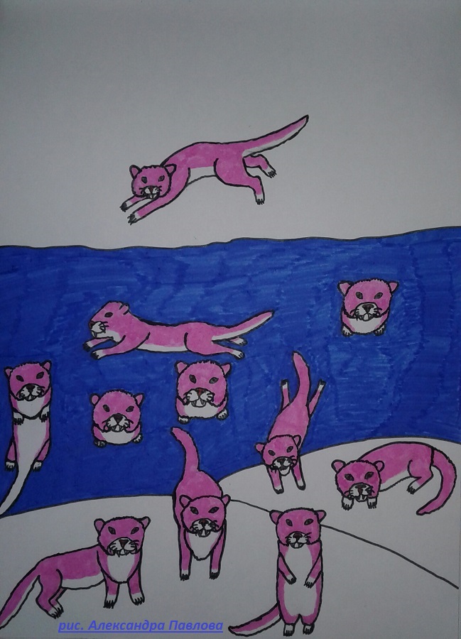 – Саблезубые выдры живут в озёрах и питаются рыбой. Высота в холке – до сорока сантиметров. Быстро плавают, живут на самом дне. Кроме лёгких у них есть жабры. При опасности могут вызвать водовороты, которые мутят воду и помогают им оставаться незамеченными. Шерсть густая и водонепроницаемая, розовая сверху, белая снизу. Название выдрам было дано за их необычно длинные зубы. – рассказал Леон.