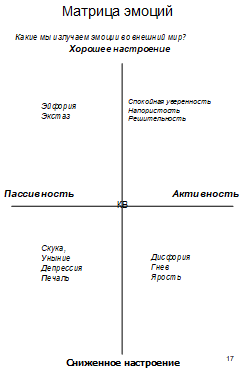 Проводя тренинги по стресс-менеджменту, управлению эмоциями, я обучаю людей диагностировать свои эмоции по вышеприведенной матрице, образованной двумя осями: горизонтальная ось – энергетика, вертикальная ось – выраженность хорошего настроения.