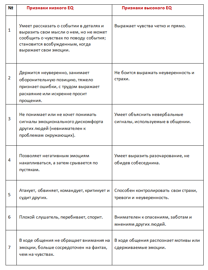 Итак, человек с высоким ЕQ умело находит выход из сложных ситуаций, легко и конструктивно решает проблемы, доброжелателен и приятен в общении, старается избегать конфликтных ситуаций, самодостаточен и независим, реалистично оценивает свои способности, инициативен.