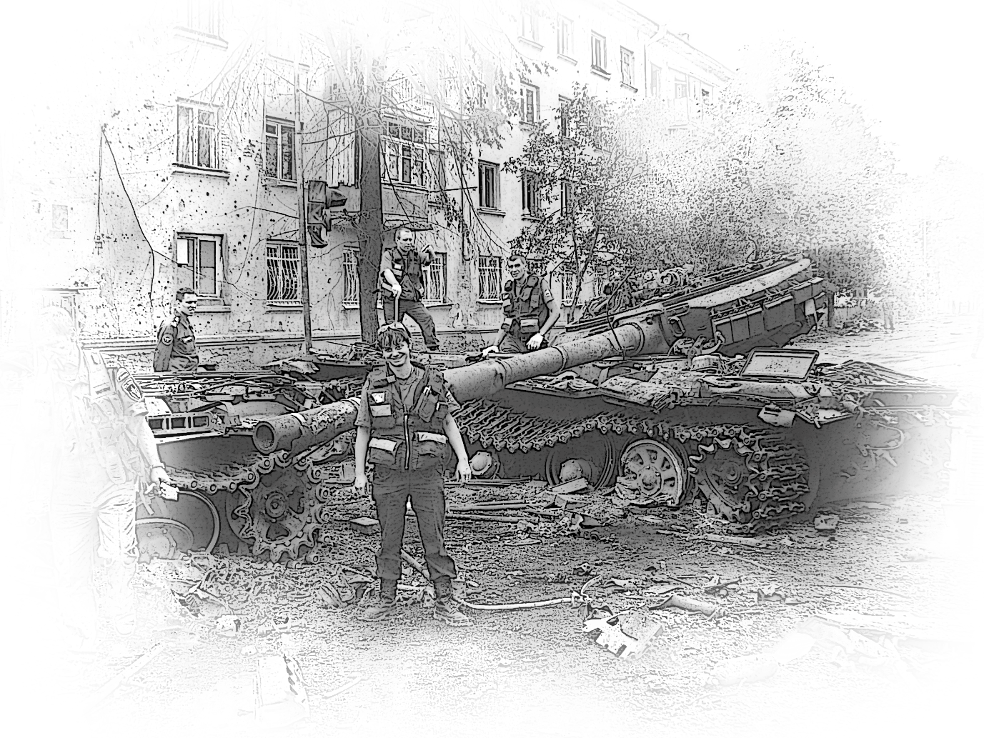 На следующий день мы с Николаичем разъехались с группами. Я оказалась в той, где старшим был Дима Ситко – не только водолаз, но и профессиональный сапер. Алексей попал в эту же группу автоматчиком. Нам было поручено снятие вооружения с трех подбитых танков. Один из них разорвало на куски детонацией боекомплекта. Башня танка пушкой воткнулась в крыльцо Министерства юстиции республики и торчала из здания, как гвоздь с широкой шляпкой. Две других бронемашины наполовину обгорели и могли рвануть в любой момент. Перекресток, который мы тут же назвали «площадью трех танков», был усыпан отстрелянными гильзами разного калибра, бесформенными кусками алюминия и прочим металлическим мусором. Работа предстояла внушительная. Саперы просеивали останки техники, бережно снимая и укладывая смертоносные брикеты ВВ [24] в ящики с песком. Медику и автоматчику по инструкции следовало находиться на удалении, но мы не продержались ни минуты и ринулись на помощь ребятам. Под чутким Диминым руководством управились до темноты. Благо, не пришлось работать под пулями.