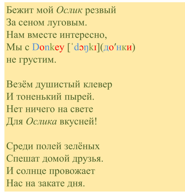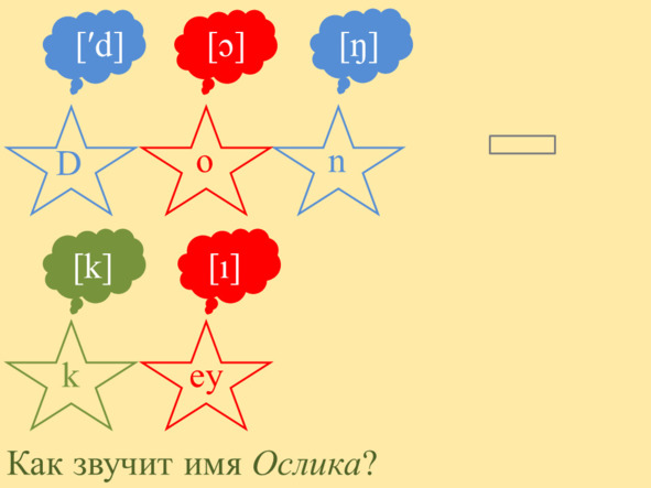 Звуки выстроились один за другим, каждый торопился занять своё любимое место. Они дружно пропели имя Ослика: [d] (д) [ɔ] (о) [ŋ] (н) [k] (к) [ɪ] (и).