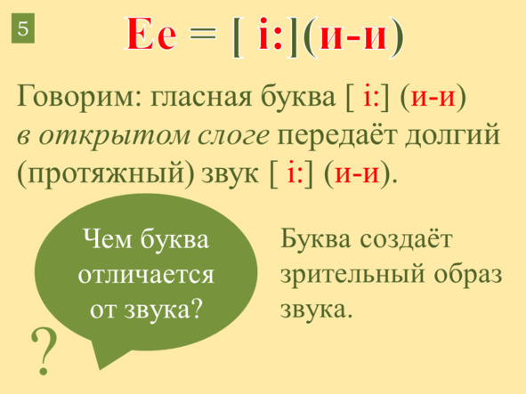 E: Я гласная буква Ee (и). В открытом слоге (слово оканчивается на гласную) я пою песенку [i: ] (и-и). Звук