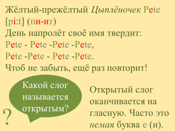 E: Я гласная буква Ee (и). В слове Pete я не пою песенку и молча делаю одно очень важное дело. Я стою в конце слова и открываю двери в домик, где живут буквы. И тогда букве Ee (и-и) (той, что в середине слова) позволяется петь песенку [i: ] (и-и).