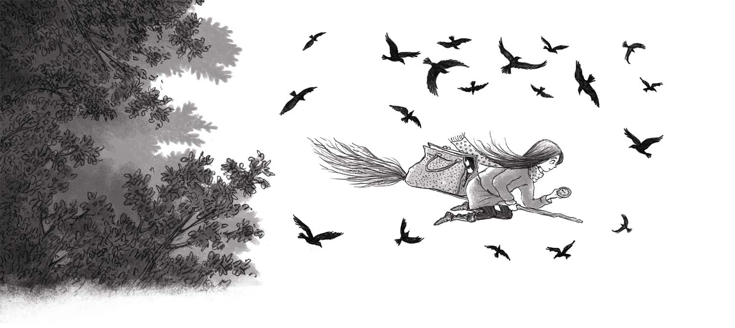 ‘I don’t know,’ whispered Willow, who was having a hard time convincing her legs that they should move. She’d never known birds to behave that way. ‘I think it might be safer if we go by foot for a while.’ She fetched her broom, which was covered in mud and leaves, and put it over her shoulder with a frown.