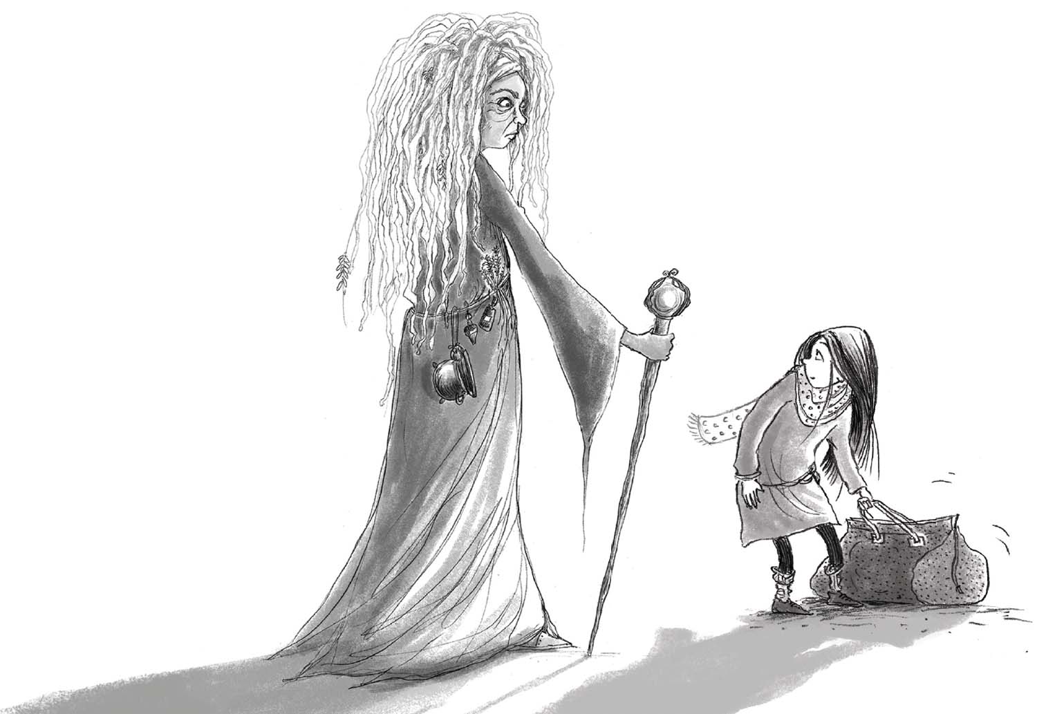 She was very tall, with long silver dreadlocks that fell down to her waist. She had skin the colour of dried almonds, and strange amber eyes, like wood snapping in a fire, which blazed into Willow’s, pinning her to the spot. There was a strange clanking sound when she walked, which was somehow unexplained by her long copper-and-silver-coloured robe, and she moved with the aid of a large opal-topped cane.