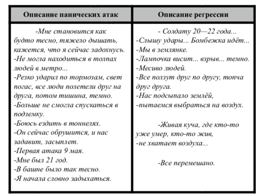 Я начинаю зачитывать Тоне ее фразы, которыми она описывала свои панические атаки, и фразы из регрессии (смотри таблицу):