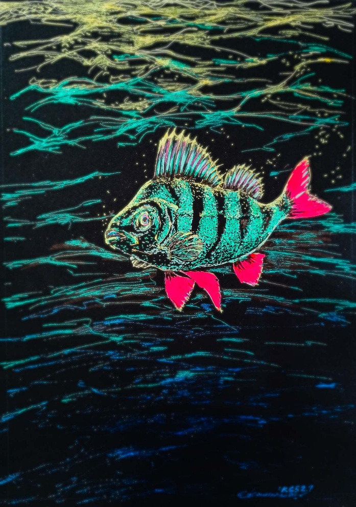 И тут из глубины зелёной мглы проявляясь как из тумана, всплыл окунь. Окунь как играя расщеперил парусом иглы яркого черно-красного спинного плавника, манерно выгибая бок, вытаращил круглый глаз в золотом ободке на Амоса. Волна озноба прокатилась по телу у него.