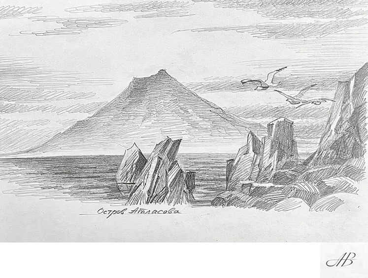 Наконец, казаки поднялись за Атласовым на высокий утёс, далеко упирающийся в море, и обомлели… какая ширь морская! А Атласов уверенно прошёл на самый край утёса и, сложив руки на груди, стал с любопытством вглядываться в морские дали. Ветер трепал его волосы, а он, широко раскрыв рот, вдыхал морской солёный воздух. Вдруг, он зычно закричал: