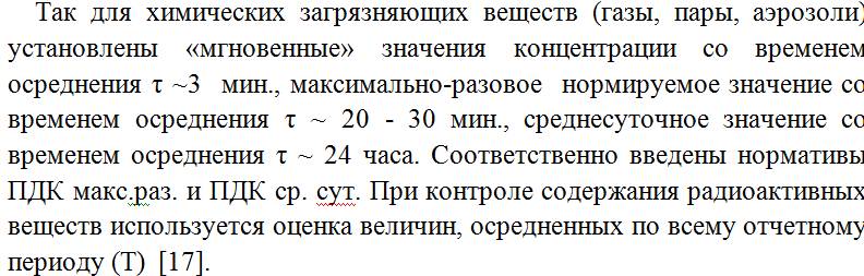 Для аттестации источников эмиссии и оценки качества воздуха в рабочей зоне предприятий или воздуха населенных мест эти характеристики должны быть различны, что вытекает из различия в «физическом» смысле имеющихся границ допуска ПДВ, (ПДС) или ПДК для радиоактивных и нерадиоактивных ЗВ. Вредное воздействие ЗВ в воздухе непосредственно связано со временем экспозиции.