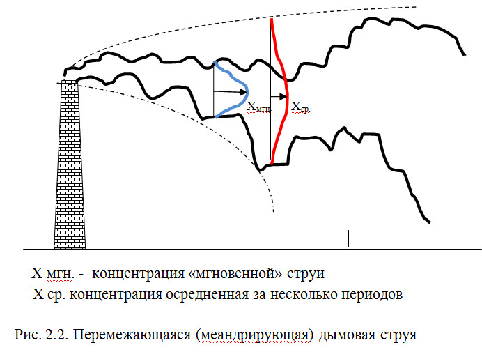 Измерения концентрации ЗВ в источниках выбросов и атмосферном воздухе показали, что результаты могут существенно зависеть от времени осреднения (времени отбора проб) [8 ]. Эта проблема имеет наибольшее значение для интерпретации данных измерений концентрации ЗВ в атмосферном воздухе и пылегазовых выбросах предприятий и не связана непосредственно с качеством использованной измерительной аппаратуры. Проблема связана непосредственно со случайным характером изменения во времени и пространстве гидрометеорологических параметров в точках наблюдения, а также комплекса технологических факторов. Однако проблема осреднения имеет место вообще при измерении и анализе любых, зависящих от времени случайных процессов [11]. Данные, полученные к настоящему времени показывают, что учет времени осреднения (времени отбора проб) – это чрезвычайно сложная операция. Например, если источник загрязнения атмосферы высокая труба, а загрязнения воздуха осуществляется под действием волнообразного дымового шлейфа (так называемая перемежающаяся или меандрирующая струя рис. 2.2.), то концентрация ЗВ может отсутствовать в один момент и достигать максимума 30 секунд спустя.