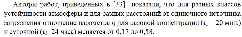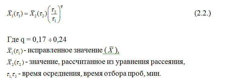 Таким образом, соотношение (2.2) рекомендуется для прогнозных оценок, если можно экспериментальным, а не из расчета рассеяния, путем оценить и рассчитать концентрацию, осредненную за некоторый период времени. Для больших периодов осреднения вместо (2.2.) рекомендовано соотношение: