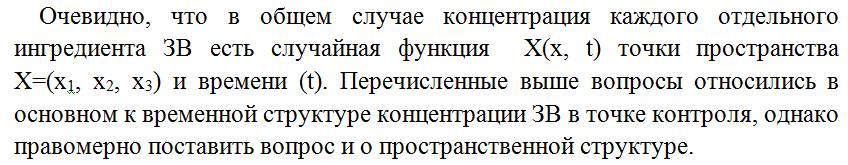 Если подобные формулы и дают представление о соотношениях между соответствующими величинами, то в силу локальных причин не позволяют оценить возможные экстремальные значения концентрации. Они не дают ни каких рекомендаций и алгоритмов при определении входящих в них величин, то есть по организации соответствующего контроля [8,9]. Единственная рекомендация, которая приводится в упомянутых работах, состоит в том, что любые данные нуждаются в коррекции и время отбора проб (время осреднения) всегда должно учитываться и приводиться вместе с данными о концентрациях.