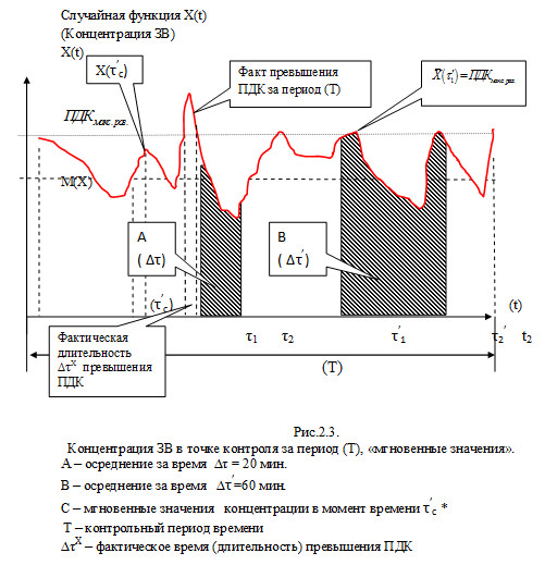 Пример иллюстрации случайной функции, представляющей временную изменчивость концентрации некоторого ингредиента ЗВ в воздухе и ее пересечение с границами допуска – ПДК представлены ниже на рис. 2.3. Фактическая реализация случайной функции и пересечений контрольных уровней показана на рис. 9.9. приложения.